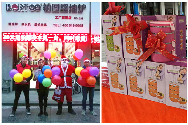 本次“暖裝節”恰逢圣誕前后,鉑圖電氣在貫徹“暖裝節”熱力四射的優惠方針時也力求帶給您視覺上不一樣的新鮮感覺。走近鉑圖電氣工廠直營店,您一定會被入口處的圣誕老人和五顏六色的精美禮盒所吸引,精致的陳設充滿了童話般的夢幻氣息。更重要的是鉑圖電氣這次“暖裝節”還向群眾免費贈送各種精美禮品。鉑圖電氣工作人員紛紛走上街頭,向人們贈送禮物,帶去“溫暖”的祝福,吸引了大量群眾圍觀參與,在有序領取禮物的間隙,鉑圖電氣工作人員為大家介紹了本次“暖裝節”的詳細情況,引起了在場群眾的極大興趣,紛紛到店參觀,有的群眾還為鉑圖電氣當起了“宣傳大使”,在朋友圈為鉑圖電氣“暖裝節”進行集贊宣傳,當然鉑圖電氣也為部分朋友送上了鉑圖高端凈水機的大禮。