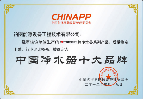 陜西鉑圖能源設備工程技術有限公司被中國名優品牌監督委員會評為“中國凈水器十大品牌”。